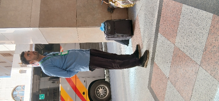 An adult male stands on a tiled pedestrian walkway in Medina, Saudi Arabia, likely in the vicinity of the Prophet's Mosque, characterized by ornate, light-colored architecture visible in the background. The man, appearing to be of South Asian or Middle Eastern descent, has short dark hair and a beard. He wears a light blue long-sleeved collared shirt, dark trousers, and dark athletic shoes, with a green lanyard and ID holder visible around his neck. He stands with hands clasped behind his back, facing left and looking slightly upwards. To the left, behind him, the side and front wheel of a grey bus with orange and yellow diagonal stripes are partially visible. To his right, a black wheeled suitcase with a light blue object on top rests against a light-colored building column. The ground features a checkered pattern of light grey and pinkish-brown square tiles. In the background, a large, multi-story building with arched windows and intricate Islamic architectural details is brightly illuminated. A yellow and white striped bag is partially visible on the ground to the far right.