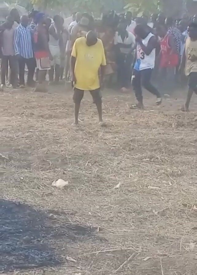 middle-aged man in a yellow shirt and shorts standing in a field, surrounded by a crowd of people. The ground is dry and covered with dead grass and dirt. There is a small area of blackened ground nearby, suggesting a fire may have occurred. The man appears to be dancing or moving erratically, as the crowd observes. The background shows trees and possibly a building. The scene is slightly hazy, with the lighting suggesting it is daytime. The overall atmosphere appears informal and possibly celebratory, despite the slightly charred ground.