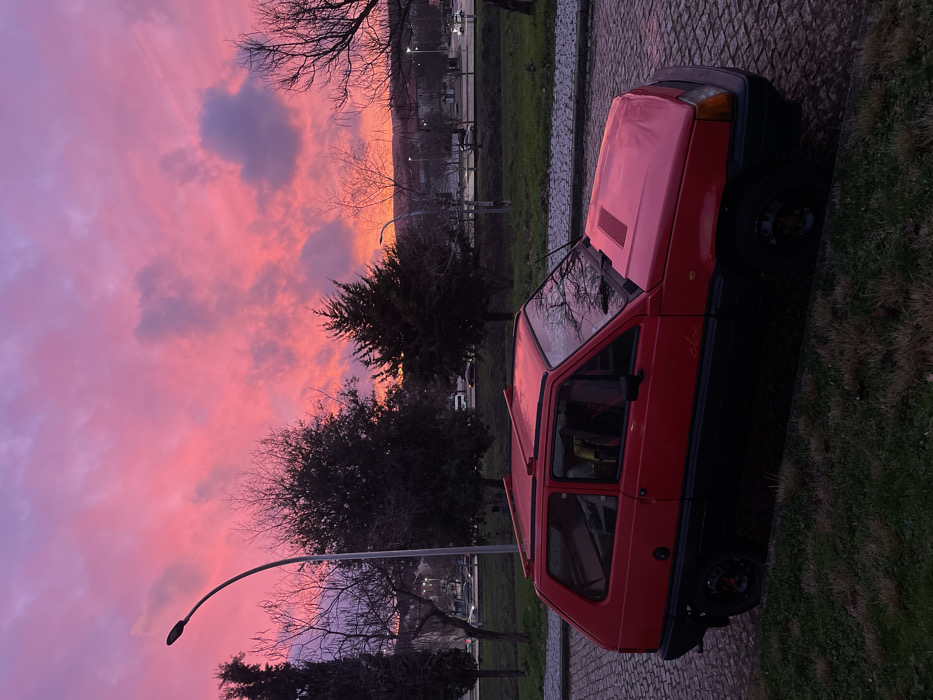 A vibrant, pink-hued sunset fills the sky above a parked red car. The vehicle, situated on cobblestone and grass, reflects the colorful sky in its windows. Bare trees and a street lamp are silhouetted against the brilliant twilight. Other trees and city infrastructure can be seen in the background. The scene captures a serene moment with contrasting natural beauty and urban elements.