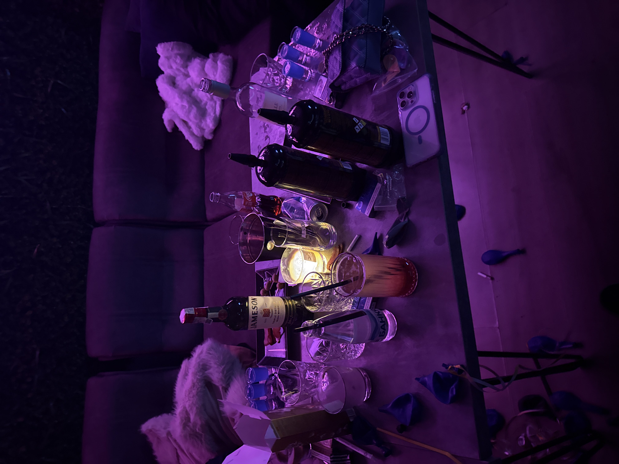 The scene depicts a table covered with various items, including bottles of alcohol (wine and Jameson whiskey), glassware, a mobile phone, a purse, and what appears to be party supplies (balloons, shot glasses, etc.). There are also personal items scattered on the table such as a lighter, cigarettes and keys. The table is next to a couch, which is located against a dark backdrop. The lighting is predominantly purple. There is nothing in the image to confirm if the image was taken in Karlovo, Bulgaria.