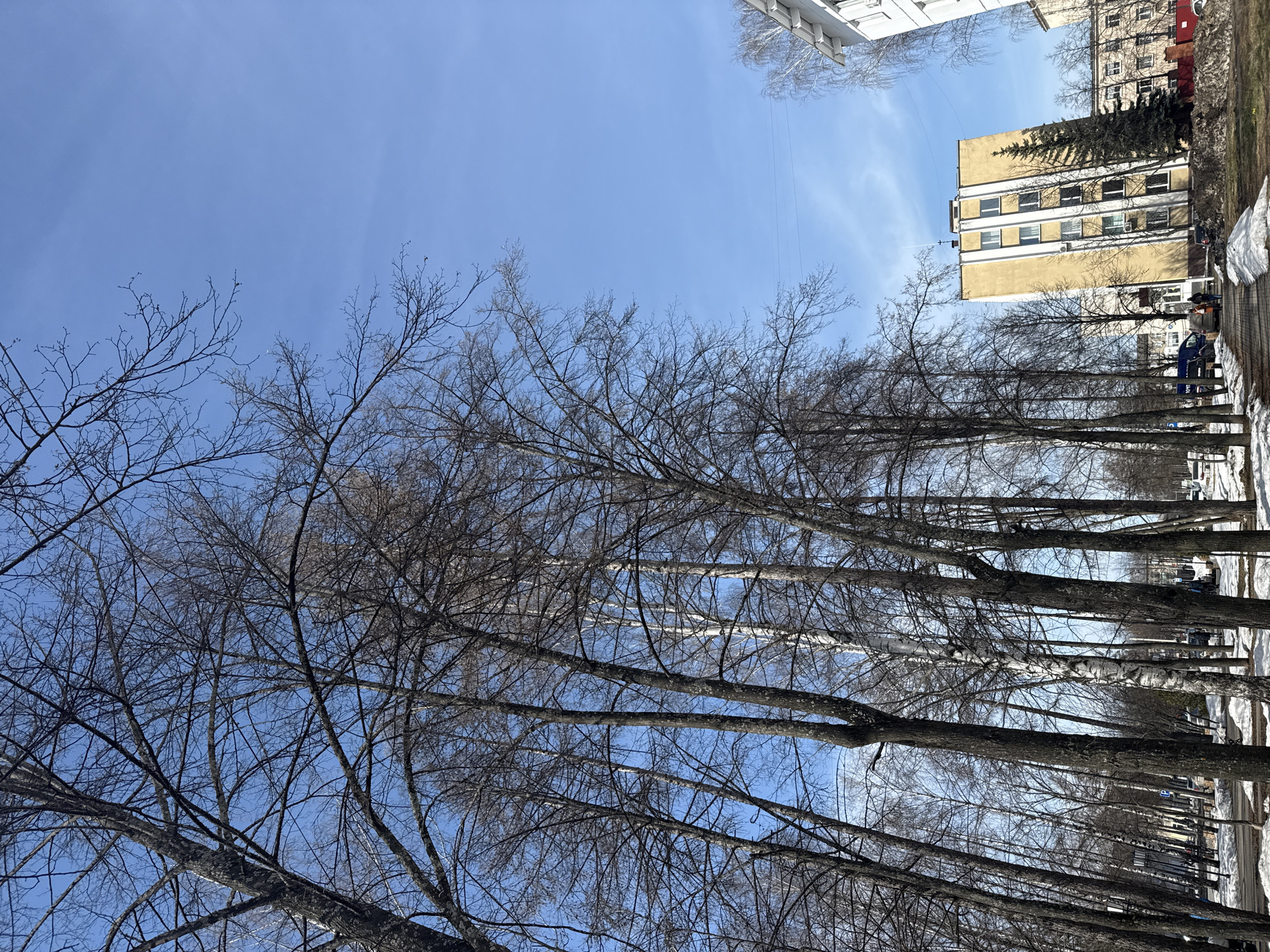 The image depicts a street scene in Chaikovsky, Russia, taken from a low angle looking up. A row of bare trees lines the street, their branches reaching up against a clear blue sky. In the background, buildings are visible, including a multi-story yellow building with multiple windows and a taller, lighter-colored building partially visible at the top of the frame. Patches of snow remain on the ground along the sidewalk. People can be seen walking along the sidewalk near the buildings. A car is parked near the sidewalk. The trees are the most prominent subject in the frame, with their intricate network of branches creating a stark contrast against the sky.
