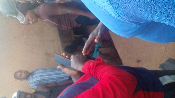 A group of people are indoors, gathered closely. One person holds a dark tablet with fingers tapping the screen. Another individual in a red and blue shirt is seated nearby. Several other people can be seen wearing various attire, including a striped shirt and a maroon top. The background is a muted wall color with darker accents.