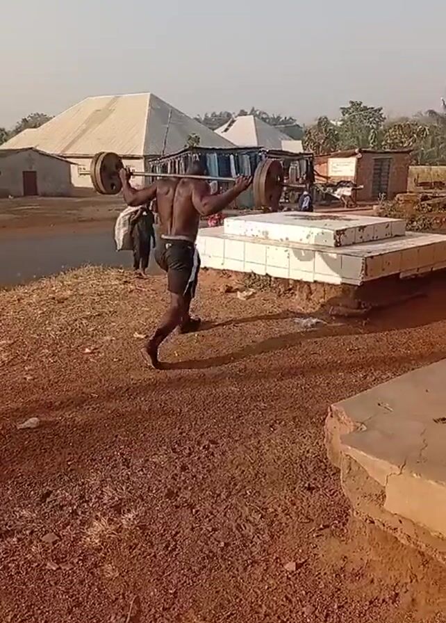 muscular, shirtless Black man doing lunges with a barbell across his shoulders. He is wearing dark shorts and shoes. The ground is dirt, and there is a small, tiered white structure in front of him. In the background, there are buildings, laundry hanging on a line, and two children, one carrying a large white bag. The video is shot from under a shelter of some kind, revealing a broken concrete edge.