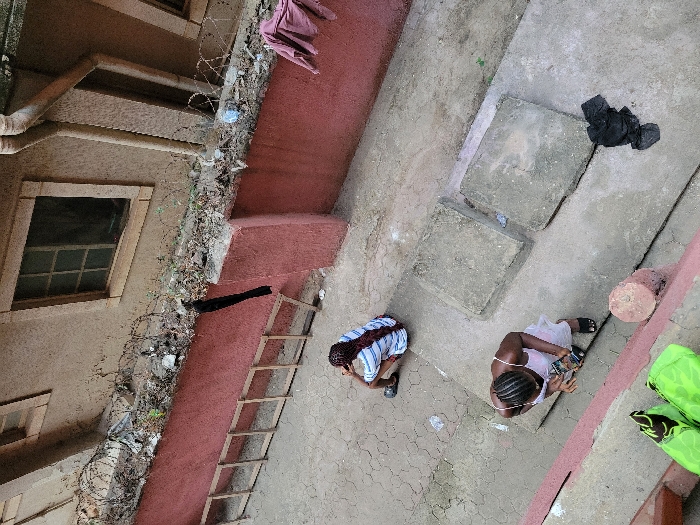 An aerial shot reveals two people on a cracked concrete surface next to a building. One person, in white attire, is using a cell phone. A second person is bent over, possibly cleaning. Nearby are two concrete blocks, a discarded black trash bag, and green plastic items. The building has a window, a red ledge with a ladder, and barbed wire along its side. Clothing hangs over the edge of the roof.