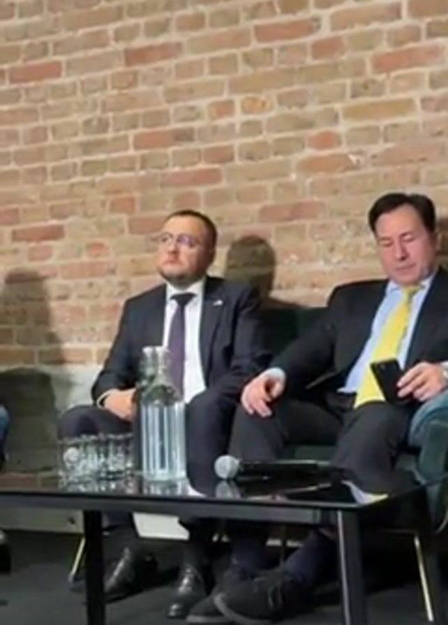 three people sitting in chairs. A man wearing a dark suit and glasses sits in a chair to the right, his legs crossed. To his left sits another man in a dark suit with a yellow tie, looking at his phone. A woman wearing a brown dress is seated to the left of the man with glasses. A black table in front of them holds a microphone, a bottle of water, and some glasses. The background consists of a brick wall.