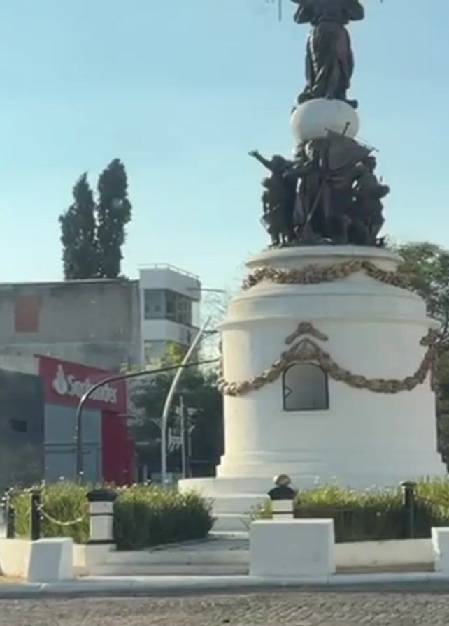 white monument topped with statues in a roundabout. In the background is a building with a large Santander bank logo. A small fountain is in the foreground with water spraying into the air. The camera pans right, showing palm trees and other trees lining the street next to the monument. Cars are driving on the street. In the distance, a tall, modern-looking building is visible. Someone is speaking in Spanish, mentioning a restaurant.