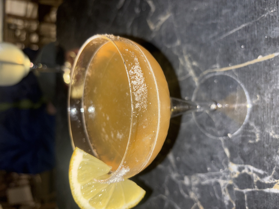 The image presents a close-up view of a cocktail served in a coupe glass, situated on a dark, marble-patterned table in a commercial establishment located in Palaiseau, France. The glass contains an amber-colored liquid and features a visible sugar-frosted rim. A yellow lemon wedge is affixed to the left side of the glass rim as a garnish. The background is out of focus, revealing the blurred outline of another glass containing a light-colored liquid towards the upper right, and the indistinct form of an individual wearing a dark blue garment towards the upper left. The ambient lighting suggests an indoor evening setting, consistent with a bar or restaurant environment.