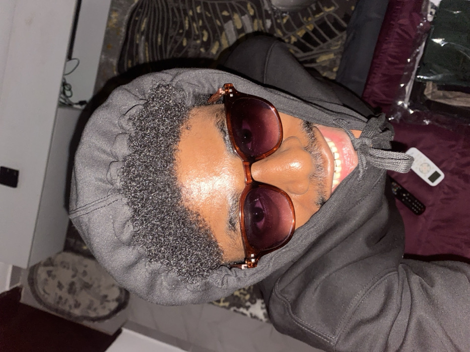 An indoor scene in Igboefon, Nigeria, features a male individual captured in a high-angle, close-up shot, looking directly at the camera with a wide smile. The individual has dark skin, short, curly dark hair visible beneath a pulled-up dark grey hoodie, and wears brown-framed sunglasses with dark, purplish lenses. A thin mustache and stubble are present, and the hoodie's drawstring is tied around the neck. The background consists of a burgundy-colored surface below the individual, displaying two remote controls (one black, one white). To the right, a stack of folded garments, some in clear plastic packaging, including items in burgundy, dark green, and light beige, is visible. Portions of a patterned rug or floor are present in the upper corners, and a dark, rectangular object is mounted on a light-colored wall in the upper background.