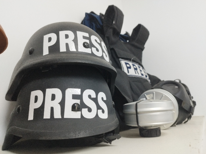 - "In Dura, Palestinian Territory, a forensic examination of the scene reveals journalistic protective equipment displayed indoors on a light-colored, flat surface against a plain, light wall" by FM-sbnkb2, licensed under CC BY 4.0
