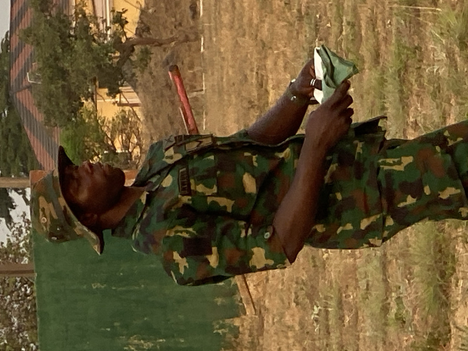 A soldier in camouflage uniform and hat stands outdoors during the day. He looks to his left and holds a folded, green cloth in his hands. Trees, a building, and dry grassy fields surround him. The word "NIGERIA" is visible on his uniform. A thin, red object sticks out from behind his left shoulder. He wears rings and a bracelet on his left hand.