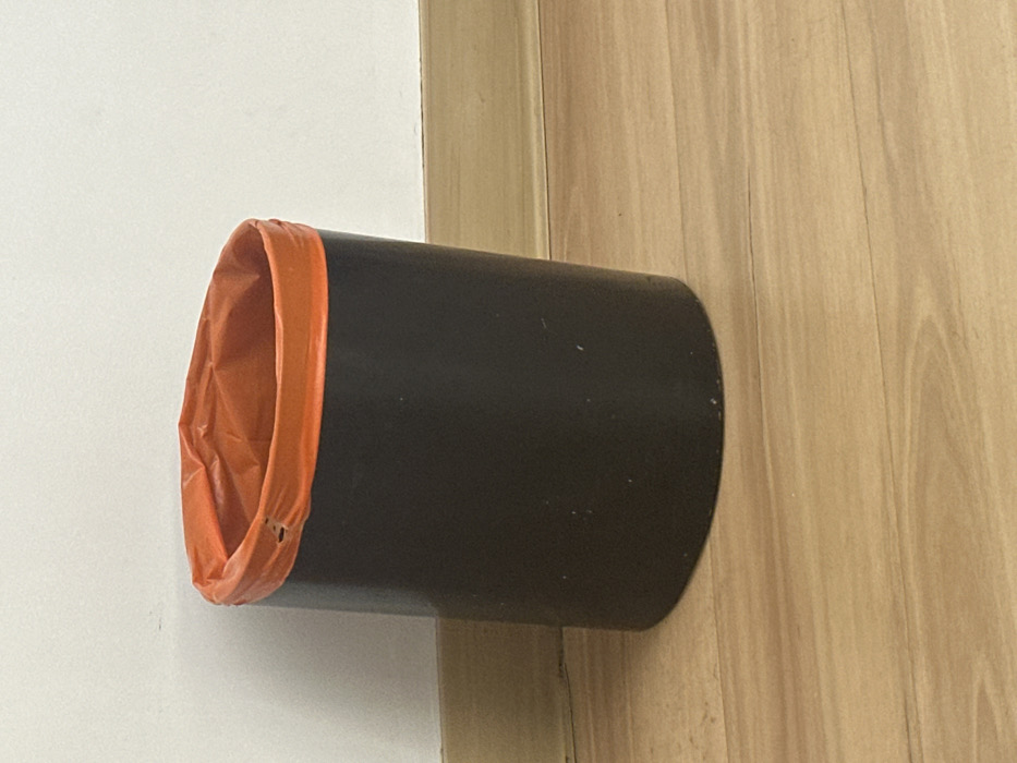An indoor scene depicts a single dark gray, cylindrical trash receptacle positioned on a light brown wood-look floor, against a plain white wall. A light brown wooden baseboard runs along the junction of the wall and floor. The trash receptacle contains an orange plastic liner, which is folded over the rim of the can; a small tear is visible on the left side of the liner where it meets the rim. No individuals are present. No actions or interactions are depicted. The specific location within Mexico City, Mexico, is not discernible from the visual evidence provided.