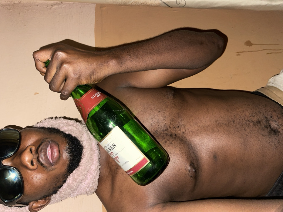 A shirtless man with dark skin, a beard, and sunglasses poses while lying on his side. He wears a fuzzy, possibly pink head covering. He is holding a green glass bottle with a red label that reads "St. Lauren Red Grape Fruit Drink." The background is a neutral beige. The photo appears to be taken indoors.