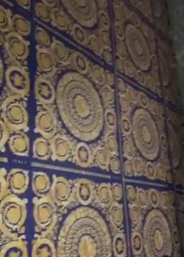 wall covered in wallpaper. The wallpaper has a repeating pattern of gold circles and other circular designs on a blue background. The word "ITALY" is visible on the wallpaper.