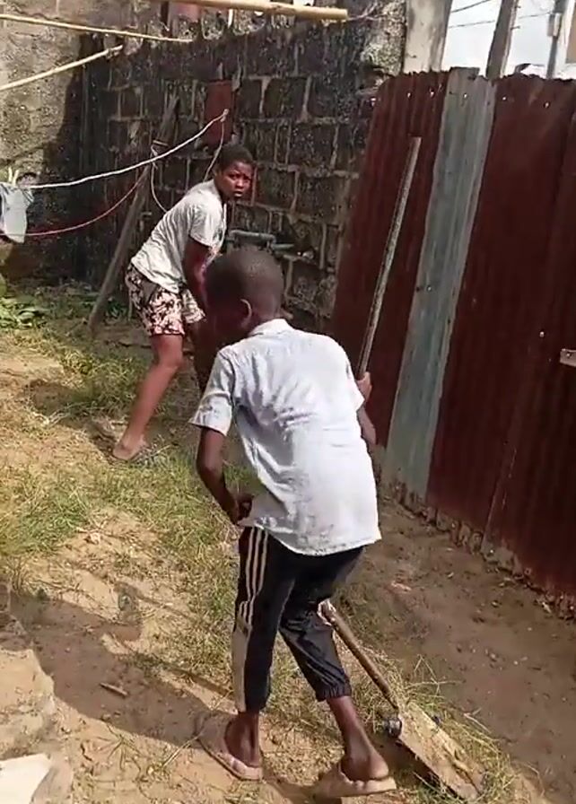 Two individuals are in an outdoor setting, seemingly engaged in yard work. One person, wearing a white t-shirt and patterned shorts, is using a tool to dig near a brick wall, possibly clearing vegetation. The other, wearing a grey t-shirt and black pants, is standing holding a long pole and looking towards the camera. The ground appears to be dirt and grass. Behind them are a brick wall and corrugated metal sheet.