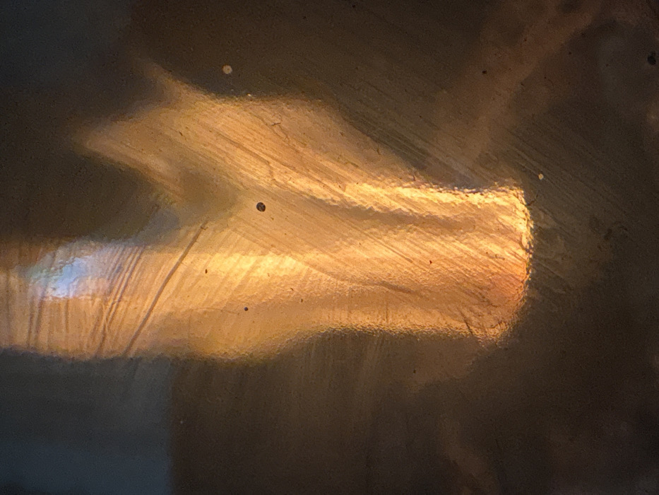 An abstract image reveals a surface with apparent brush strokes illuminated by a golden-yellow light source. The light casts elongated, blurred reflections, creating a soft, indistinct focal area. The surrounding areas are darker, possibly indicating the edge of the light's reach. Specks are scattered across the surface. The overall effect is one of warmth and diffused lighting, emphasizing texture and subtle gradients of color.