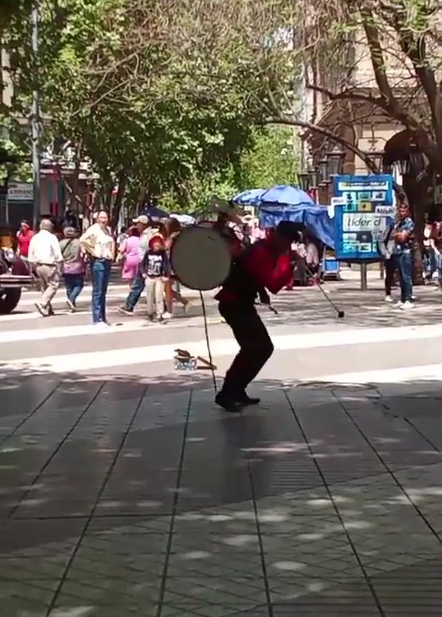 street scene with a musical performance. Two men dressed in black pants and red vests, each wearing a drum, are seen performing on a sidewalk. They are playing their drums with accompanying gestures and movements. Pedestrians stroll by and some observe the performance. Trees line the street, and buildings are visible in the background. A vintage fire engine is also visible in the background. The sidewalk is paved with a grid-like pattern, and shadows are cast by the trees. The overall atmosphere is lively.