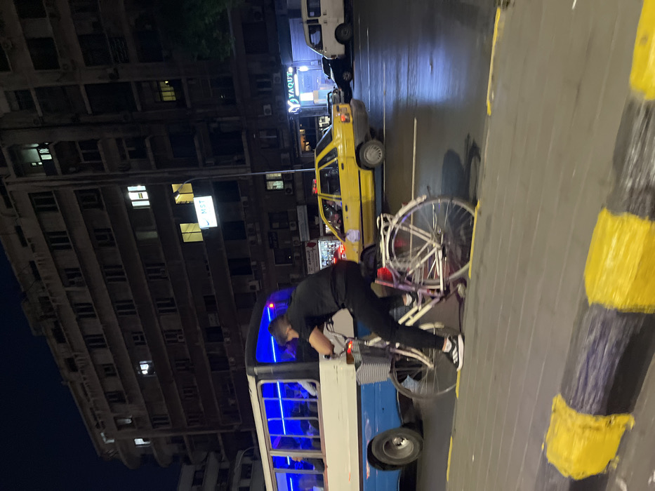 The image depicts a nighttime urban scene on a wet street within Sarouja Municipality, Syria. In the foreground, a black and yellow striped concrete barrier delineates the edge of a sidewalk. A male individual, wearing a black shirt, black pants, and white-soled sneakers, is cycling from left to right on a light-colored bicycle equipped with a front basket and an illuminated red rear light. Parallel to the bicyclist and slightly to his left, a blue and white bus with a distinctive blue interior illumination is in motion, carrying passengers. To the right of the bicyclist, on a visibly wet asphalt road reflecting ambient light, a yellow taxi sedan is proceeding in the same direction. Further right, a white commercial van is also present. The background is dominated by a multi-story building, likely residential or mixed-use, with numerous windows, several of which are illuminated, indicating interior activity. Below this building, at street level, storefronts display illuminated signage, including a white sign with "MST" in black text and a neon sign reading "YAQUT". The street surface is reflective, suggesting recent rain or damp conditions.