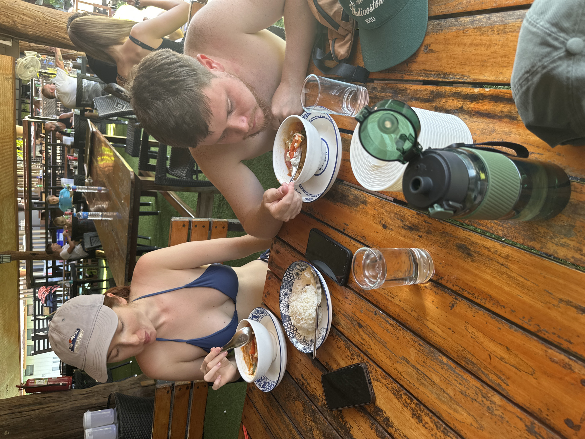 In Khao Phang, Thailand, a wooden table setting features a man and a woman consuming a meal. The man, shirtless, is seen with a bowl of food, spoon in hand. Adjacent to him are a glass, a green baseball cap, and a green water bottle. The woman, wearing a blue bikini top and a baseball cap, is also eating from a similar bowl. Her place setting includes a plate of rice, a glass of water, and two cell phones. In the background, other patrons are seated at tables. The scene suggests an outdoor dining area.