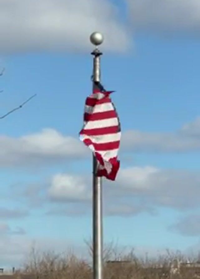 n American flag on a silver flagpole waving in the wind against a blue sky with clouds. The flag is slightly tattered. Brown, leafless tree branches are visible below the flag and in the background.