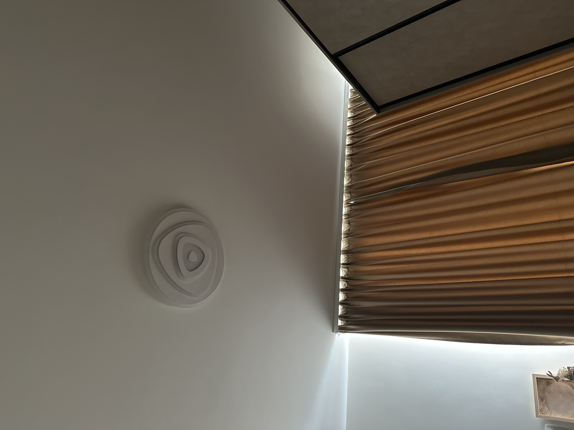 A low-angle, indoor shot reveals a minimalist interior. A white wall occupies a significant portion of the frame, displaying a circular, sculptural wall decoration consisting of layered, concentric white shapes. Adjacent to the wall, a window is partially covered by horizontally-pleated brown blinds. The top edge of the window is capped by a structural element, featuring a gray surface outlined by black framing. Light penetrates the blinds, casting a bright vertical glow down to a lower section of the wall where a partial view of a framed artwork and decorative object is visible. The image does not contain enough information to identify the location as Veliko Tarnovo, Bulgaria.