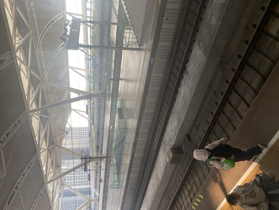 An upward-angled view shows the architecture of a train station. A massive, white steel structure forms the ceiling. Tall buildings are visible through the open sections of the ceiling. Parallel train tracks run along the side, and a platform with a textured surface is visible. Passengers are waiting on the platform. One individual is wearing a pink hoodie, a black backpack, and carrying a green bag.