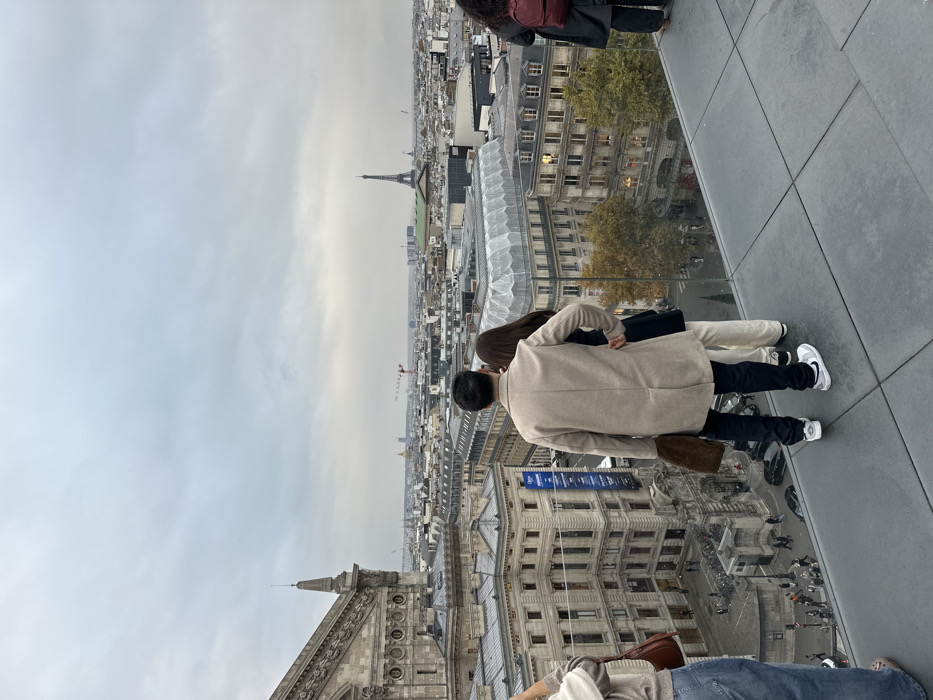 The image depicts a panoramic view of Paris, France, observed from a high vantage point, specifically a rooftop viewing terrace