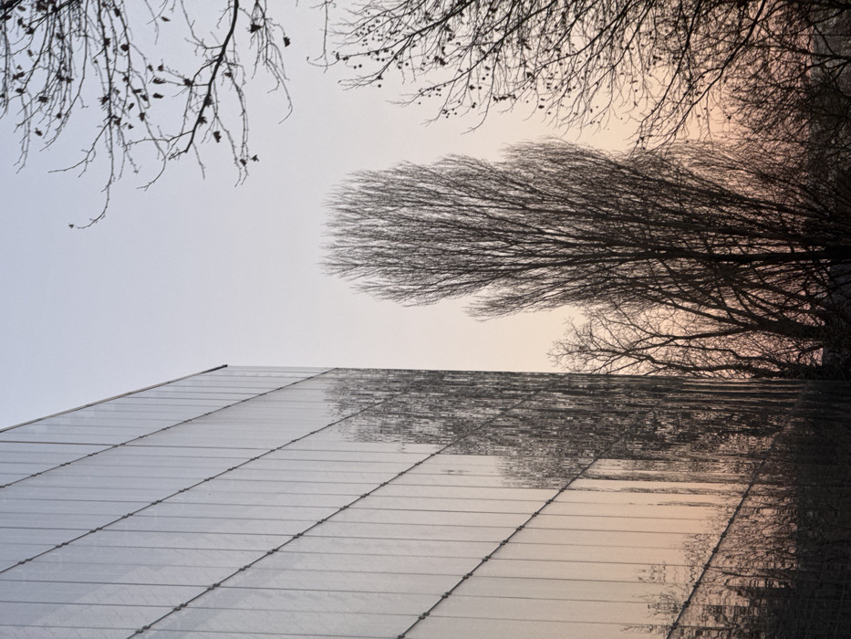 The image displays a portion of the European Parliament's Louise Weiss building in Strasbourg, France, observed during either sunrise or sunset in late autumn or winter. The left two-thirds of the frame are dominated by the building's modern facade, constructed from numerous vertical, rectangular glass panels. These panels exhibit distinct reflections of the surrounding environment, including distorted silhouettes of bare trees and the pastel-colored sky. To the right, a group of deciduous trees with their branches devoid of leaves stands silhouetted against the sky. A particularly tall, slender, and columnar tree is prominently positioned towards the center-right. The sky transitions from a pale blue-grey at the top to a soft, warm orange-pink hue near the horizon, characteristic of low sun angles. No human figures or specific interactions are visible within the scene.