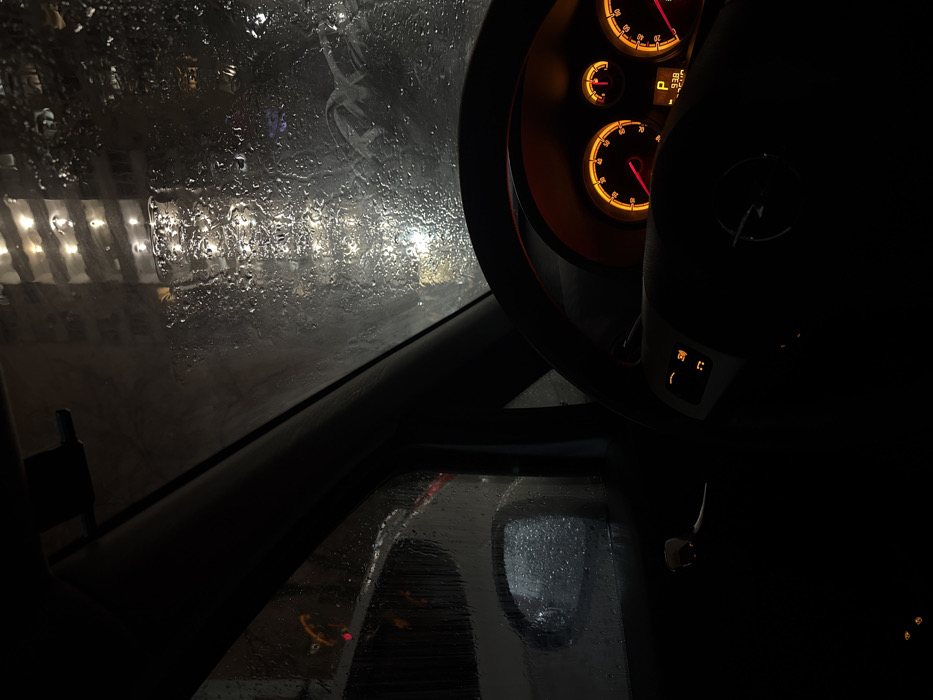 - "The image depicts an interior view from a vehicle, specifically from the driver's perspective, looking through a rain-streaked windshield at night in Krasnodar, Russia" by FM-KOZpl2, licensed under CC BY 4.0