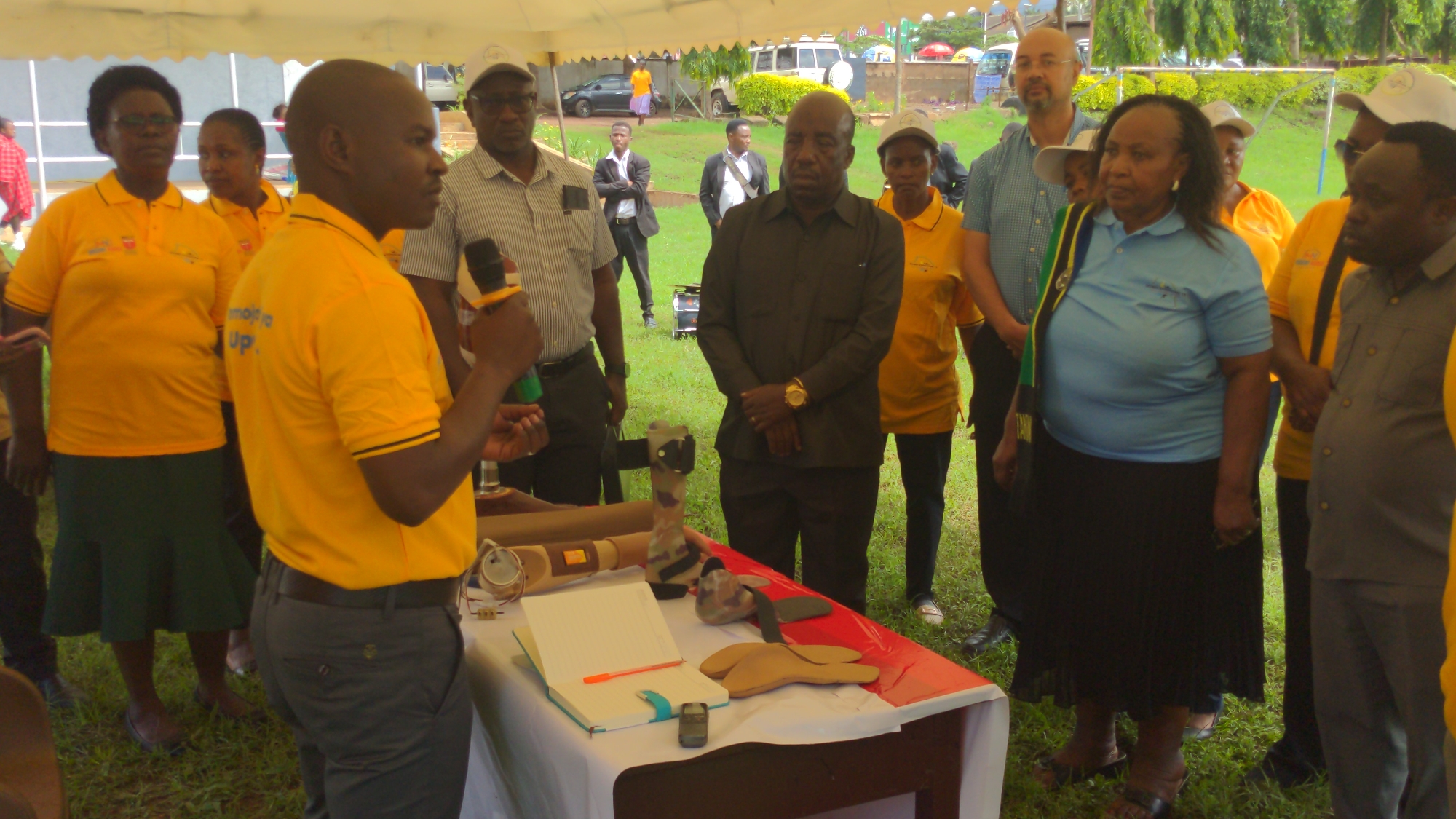 The scene depicts an outdoor presentation or event taking place under a white canopy tent on a grassy area in Moshi, Tanzania. Approximately 15-20 individuals are present, observing a speaker at a display table. In the immediate foreground, facing right and away from the camera, a dark-skinned male speaker, bald and wearing a yellow short-sleeved polo shirt and gray trousers, holds a black and green microphone in his right hand. He gestures with his left hand. Directly in front of him, a wooden table covered with a white tablecloth displays various items. These include an open notebook with a red pen, a small dark electronic device, multiple cylindrical objects resembling rolled-up plans or documents, and several prosthetic or orthotic devices. One device is camouflage-patterned, another is tan, and various components suggestive of artificial limbs or supports are arranged on a red surface atop the tablecloth. A group of attendees surrounds the table. To the speaker's left, several women wear matching yellow polo shirts, some with visible branding like "moja UP," paired with dark skirts or trousers. To the speaker's right, a dark-skinned man with glasses and a striped shirt stands. Behind the table, centered, a dark-skinned man in a dark long-sleeved shirt and trousers, wearing a gold watch, stands with his hands clasped. To his right, a dark-skinned woman with long dark hair, wearing a light blue polo shirt and a black skirt, has a multi-colored sash (green, black, yellow) draped over her left shoulder. Other attendees, including a man with a beard in a blue checkered shirt and several individuals in yellow shirts and caps, are visible behind her. The background, beyond the tent, shows a continuation of the grassy area with additional people, including one person in a bright yellow garment. Parked vehicles, including a white SUV/van and a dark sedan, are visible further back, along with green trees and foliage, indicative of an urban or semi-urban setting. The overall atmosphere suggests a formal gathering or informational session.