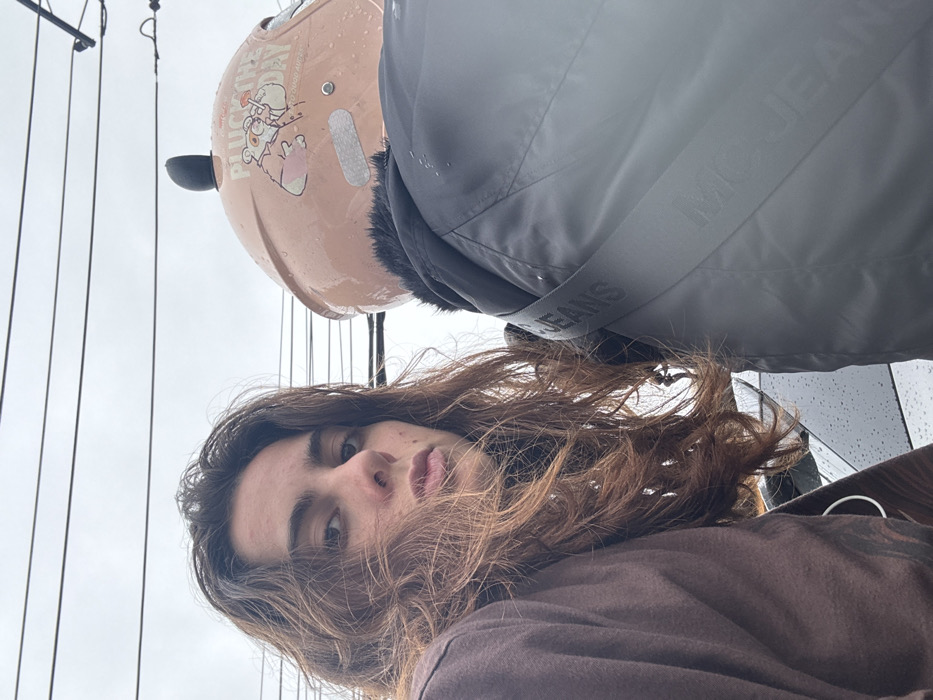 A person with long, wavy brown hair is looking at the camera. Above them is a pink helmet with cartoon bear stickers and a grey rain jacket with a strap across it, reading "MJ JEANS." The background is a gray, overcast sky with wires or cables visible. The photo appears to be taken from a slightly low angle, tilting upwards.