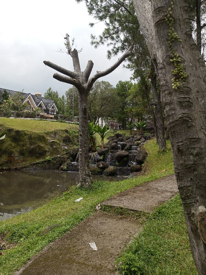 A tranquil scene showcases a small pond edged by lush green grass and a stone pathway. A unique tree with pruned branches stands near the water, while a cascade of small waterfalls tumbles over rocks in the background. Beyond the cascade are buildings, adding to the scenic view under a cloudy sky. Another tree, with fruit clusters on its trunk, stands in the foreground to the right.