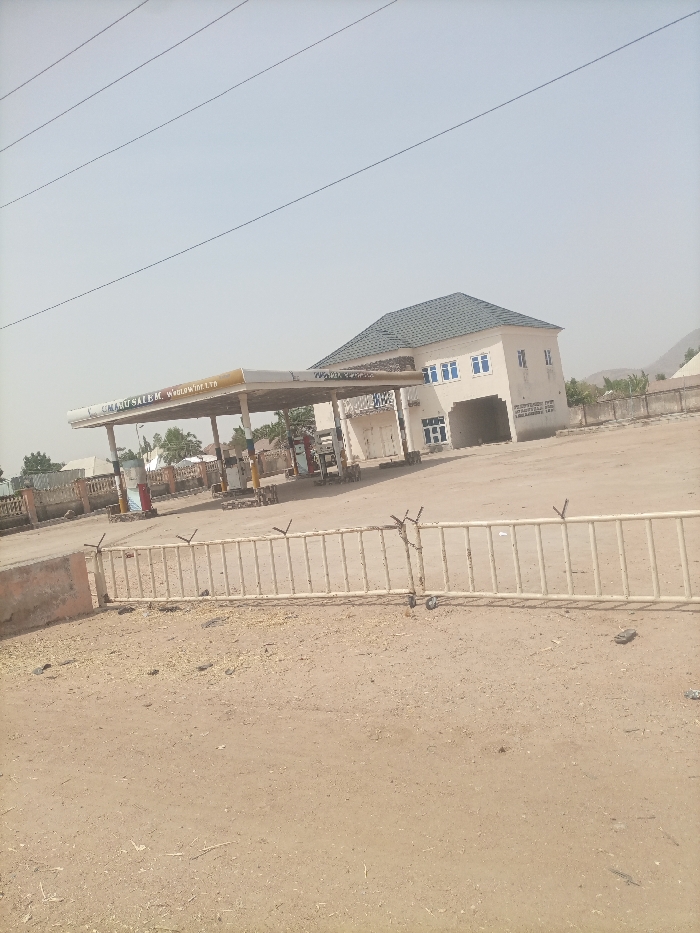 The image depicts an outdoor scene in Gulum, Nigeria, under a hazy, clear sky. In the midground, a gas station operates under a rectangular canopy with "UMARU SALEM WORLDWIDE LTD" inscribed on its fascia. Multiple fuel pumps are visible beneath the canopy. Adjacent to the gas station is a two-story building with a light-colored facade and a dark-tiled roof. The building features multiple blue-framed windows on the upper floor and what appear to be garage or store entrances on the ground floor. The immediate foreground consists of dry, reddish-brown earth with sparse vegetation and debris. A light-colored metal barrier, equipped with wheels and spiked protrusions on its upper edge, stretches across the foreground. No individuals are present, and no active interactions are observed. A single dark-colored flip-flop or sandal lies on the ground near the metal barrier. Distant hills are faintly visible in the background, and overhead power lines traverse the sky.