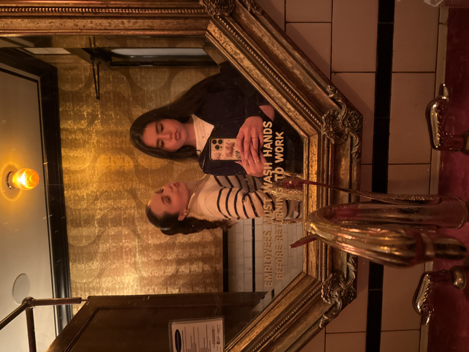 A woman takes a selfie in a gilded mirror in a restroom. The mirror frame is ornate and reflects two views of her: one from the side and one straight on. Reflected in the mirror is also a message stating, "Employees must wash hands before returning to work." Behind the mirror is gold-patterned wallpaper. A warm-toned light fixture is visible near the top corner of the frame. A golden sink and faucet are also visible in the restroom.