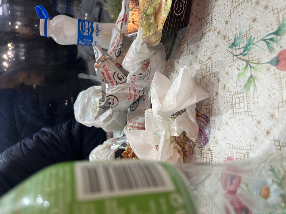 The scene depicts the aftermath of a fast-food meal on a patterned table within an indoor setting, likely a restaurant or dining area, in Sofia, Bulgaria