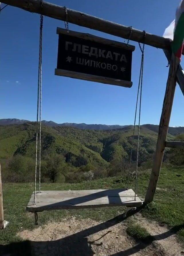 wooden swing with a sign above it that reads "ГЛЕДКАТА ШИПКОВО" in Cyrillic