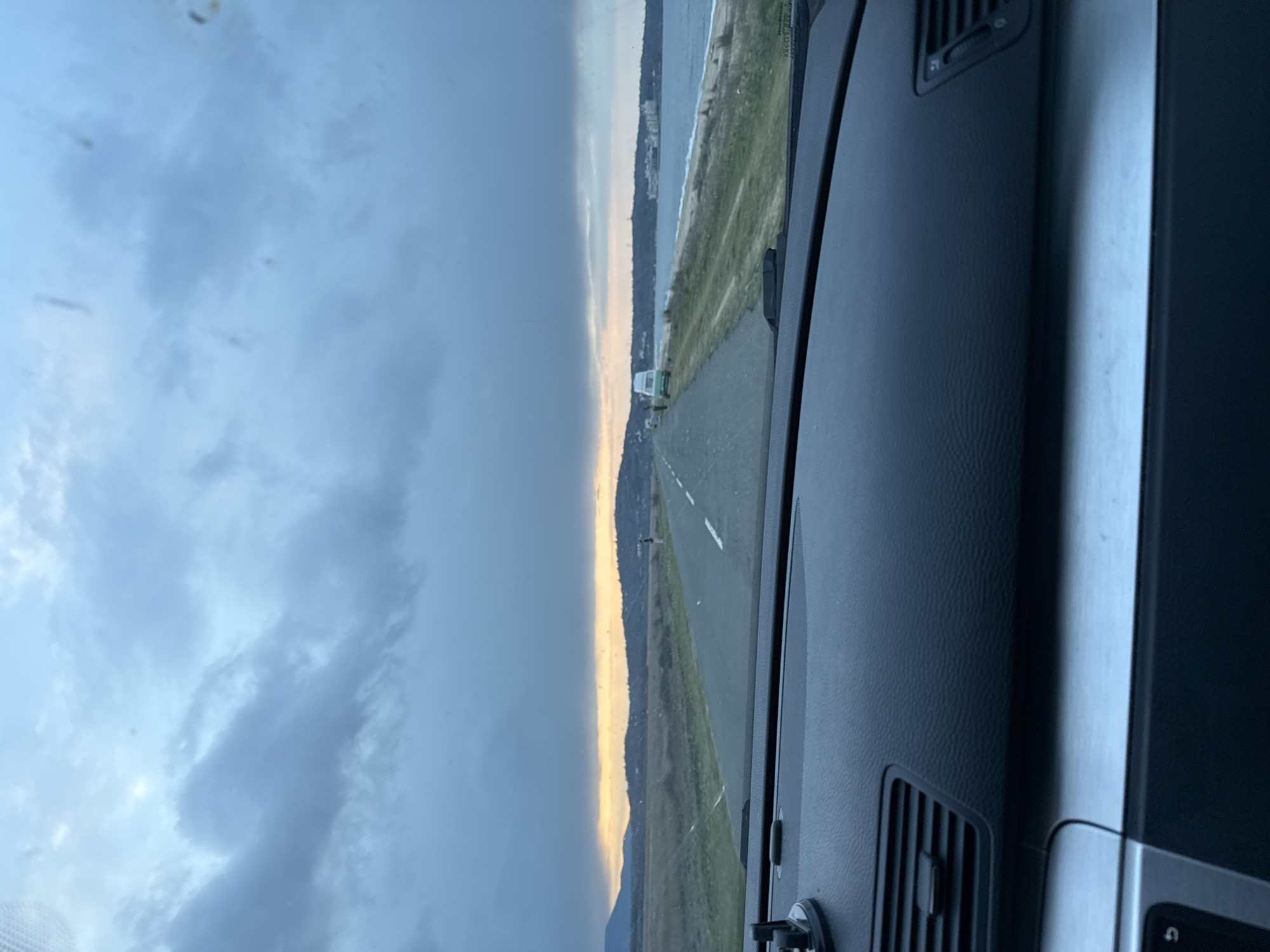 View from inside a vehicle, likely a car, looking out onto a coastal road. The road leads away from the viewer towards the sea. A building is visible on the right side of the road in the distance. The sky is overcast with dark clouds. The road is asphalt with white lane markings. Part of the dashboard and air vents of the car are visible. The image is rotated 90 degrees counter-clockwise. The location is likely Dyuni, Bulgaria, based on the road and coastal scenery visible in the image.