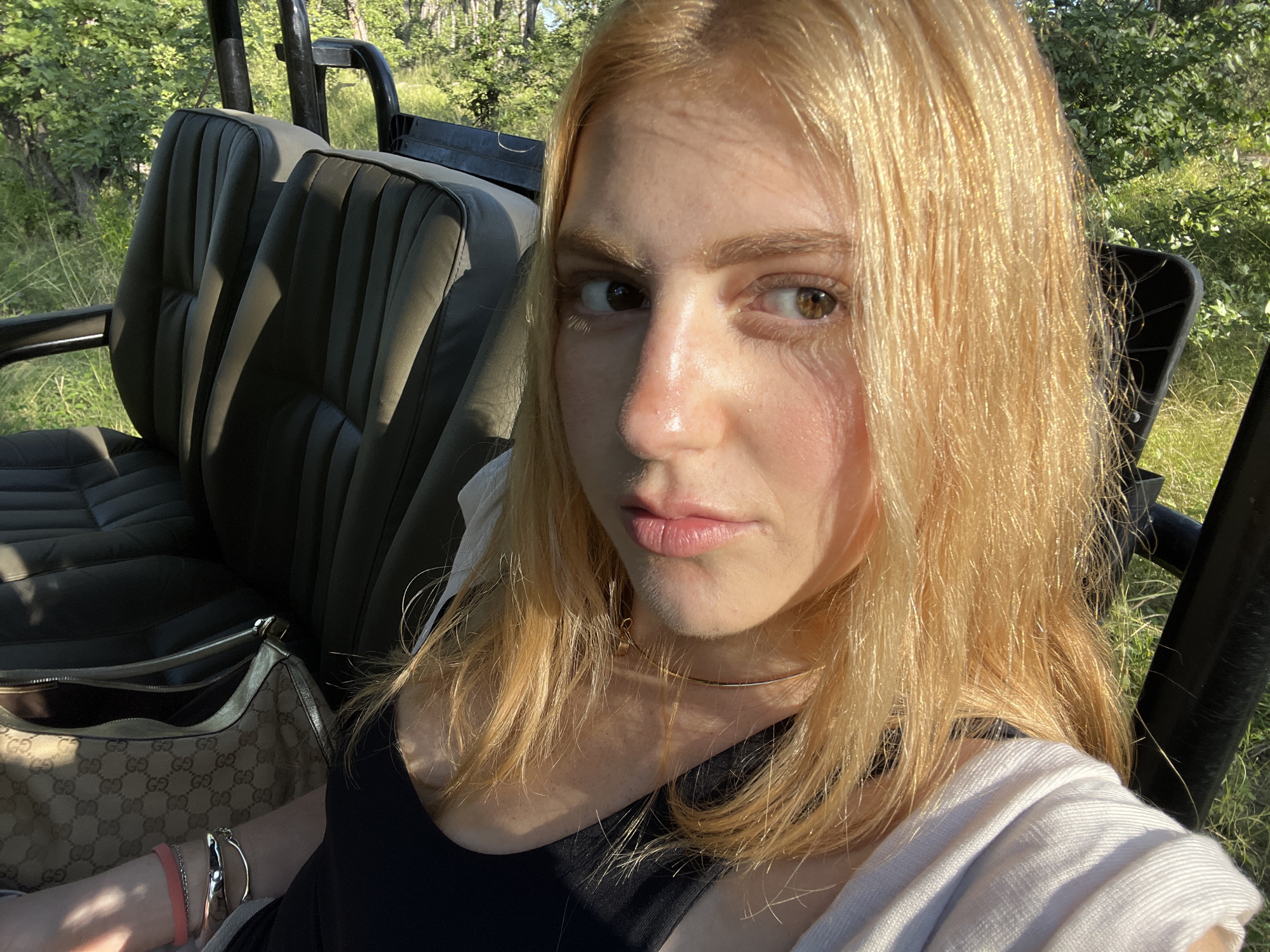 A light-skinned young woman with blonde hair sits inside a vehicle, possibly a safari jeep, against a backdrop of trees and grass. She wears a black tank top, a light-colored cardigan, and a delicate gold necklace. A Gucci handbag rests on her lap along with several bracelets on her left wrist. The seats of the vehicle are upholstered in a dark, patterned fabric. The environment suggests an outdoor setting, possibly in Khwai, Botswana, due to the greenery and potential safari vehicle. The natural lighting highlights the woman's features and the surrounding environment.