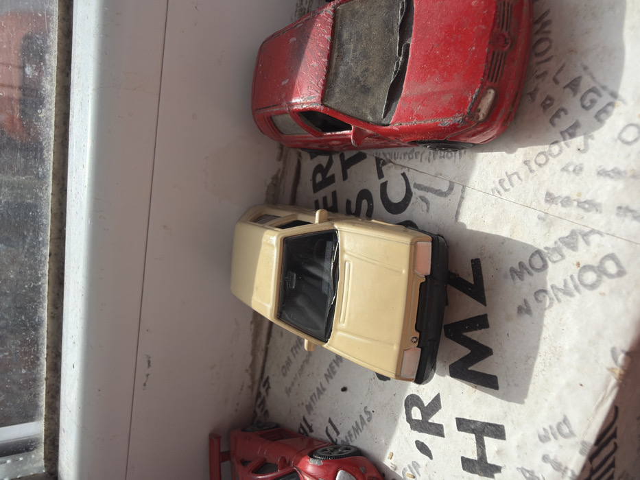The image depicts three miniature model cars positioned on a printed surface, likely paper or cardboard, which rests on a dirty white window sill