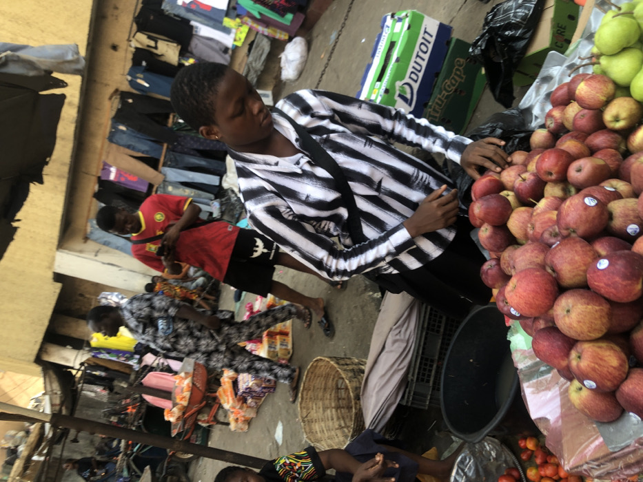 This image depicts a bustling outdoor market scene in Onitsha, Nigeria. In the foreground, a person with dark skin, wearing a black and white striped long-sleeve shirt and dark pants, is observed tending to a large display of red apples, many with white stickers, on a plastic-covered surface. Next to the apples, a smaller pile of green pears is visible. To the left, a silver bowl contains red tomatoes. Behind this vendor, a black plastic tub sits on the ground, and green and white "DUTOIT" and "Tru-Cape" branded cardboard boxes are stacked. In the mid-ground, a person in a red t-shirt with a yellow logo, black shorts, and sandals is standing, engrossed in a smartphone. To their left, another person, wearing a black and white patterned long-sleeve outfit and sandals, walks left-to-right, looking left. Further left, a child-like figure, partially visible, is seated near a woven basket. Behind the walking person, a red wheelbarrow holds numerous wrapped light-colored items, possibly bread or pastries, with additional stacks on the ground. The background features a light-colored building wall with various items of clothing, including jeans and shirts, hanging for sale on racks and lines. The ground surface appears to be rough concrete or dirt. Metal poles, likely supporting a market canopy, are visible throughout the scene.