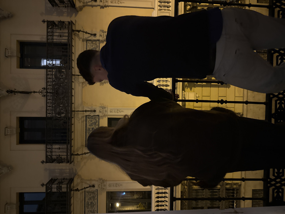 A man and a woman stand on a balcony, their backs to the camera, in front of a building. The man wears a navy jacket and light-colored pants. The woman has long, dark hair that obscures her body. The building features ornate details, windows, and decorative balconies. The scene is lit by artificial light, giving it a warm, somewhat dim ambiance. The image appears to be taken at night.