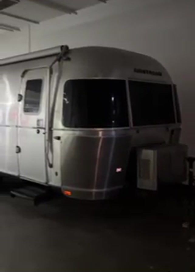 The camera pans across the left side of a parked, shiny Airstream trailer, revealing its side door, windows, and awning