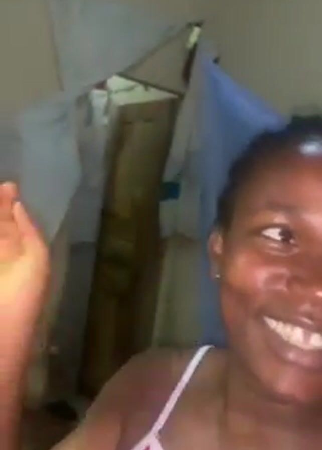 A young woman in a red and white patterned top is filming a video of herself, smiling. She briefly turns the camera to show a young boy sitting on the floor behind her before turning back to the camera. The woman jumps and the camera is knocked around. A loud crash is heard, and the woman continues filming the aftermath of something falling and breaking. The boy appears to be unharmed and continues to sit on the floor. The room appears to be cluttered and dimly lit.