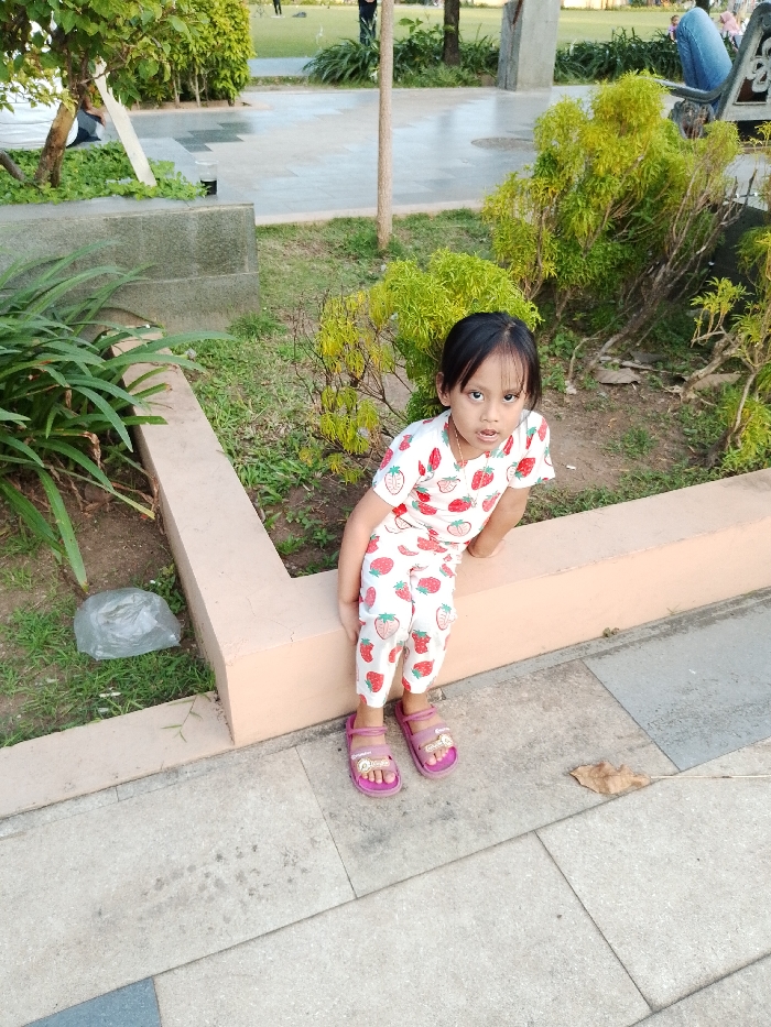 A young Asian girl, estimated to be between 4 and 6 years old, is seated on a low, peach-colored concrete wall in an outdoor park setting within Kecamatan Pati, Indonesia