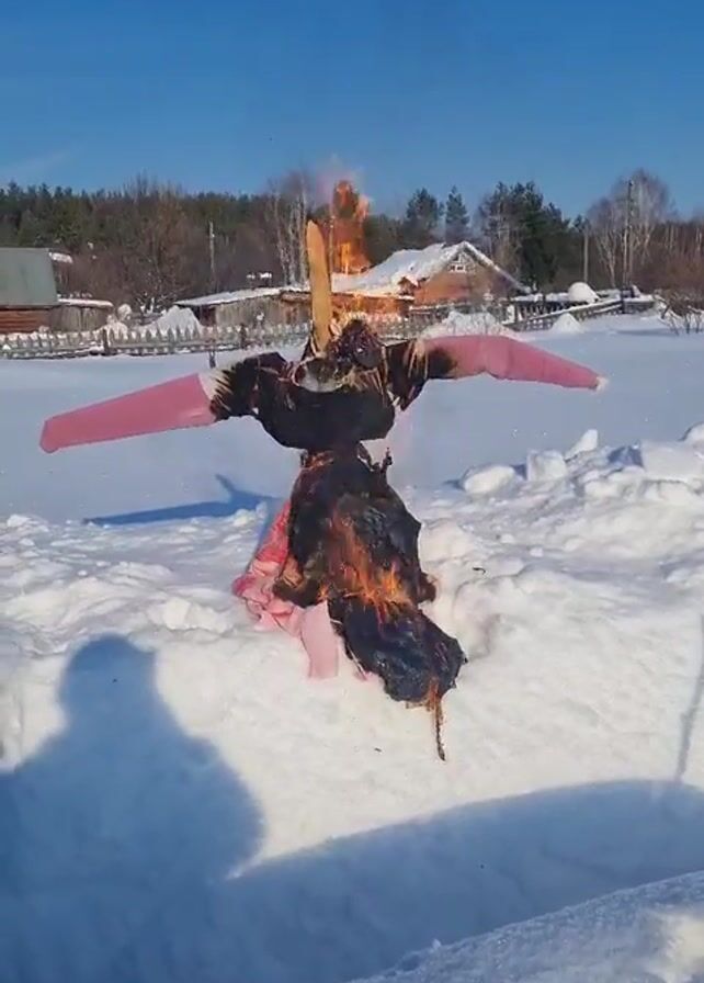 A fire consumes a doll-like figure with pink arm-like appendages that is standing upright in snow, against a backdrop of a rural scene on a bright, sunny day. The figure is heavily charred, with flames emerging from its upper portion. The ground is covered in snow, reflecting the sunlight. The background shows wooden structures, likely houses, some with snow-covered roofs. Trees are visible in the distance. The clear blue sky provides a stark contrast to the burning figure. A shadow of the person filming the video is visible in the lower left corner.