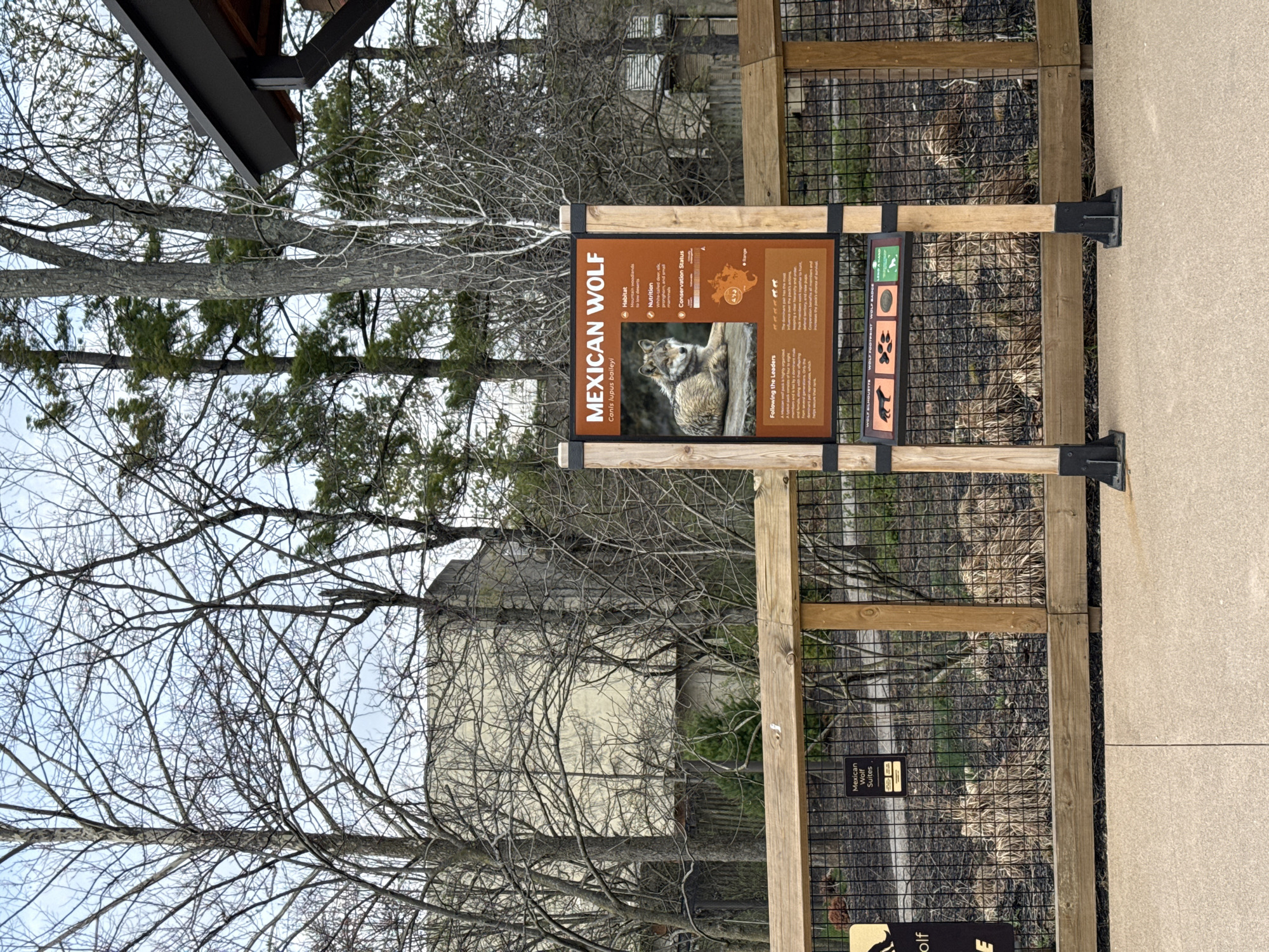 Here is a description of the image: The image shows an informational sign about the Mexican Wolf at the Columbus Zoo and Aquarium, located in Powell, Ohio