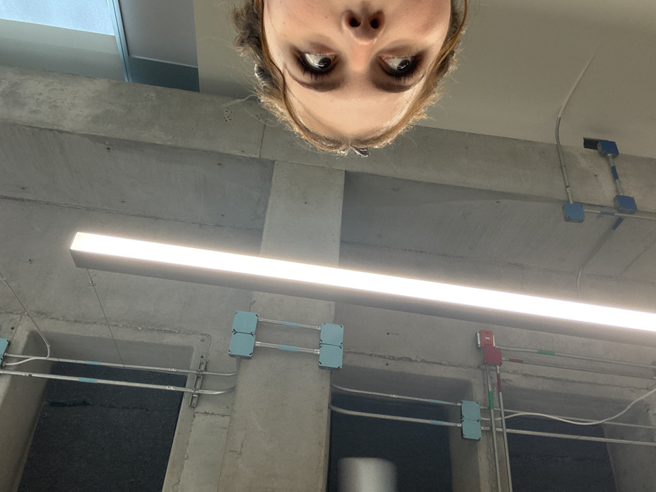 A person's face appears at the top of the frame, viewed from below. Below the face, the scene shifts to an industrial-style ceiling. The ceiling is constructed of concrete and features a bright, linear light fixture. Electrical conduits and junction boxes are attached to the concrete structure, with a mix of blue, gray, and red components. The ceiling design has a functional, utilitarian aesthetic.