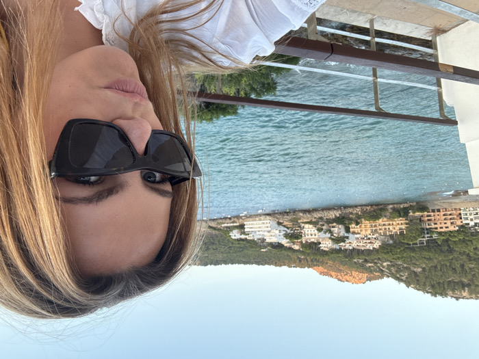 A female subject with long, light brown hair and black cat-eye sunglasses is captured in a close-up selfie, with her lips pursed. She is wearing a white collared shirt. The background depicts a coastal scene in Sant Elm, Spain, viewed from an elevated vantage point, possibly a balcony, as indicated by a brown wooden railing and a white structural element in the lower left. The calm, teal-colored bay is populated with several small boats. The shoreline features a mix of sandy beaches and rocky areas, bordered by a collection of multi-story buildings in white, cream, and terracotta tones, nestled among green trees. Behind the coastal structures, a large, tree-covered hill rises, with a reddish-brown rocky peak illuminated by the sun, suggesting late afternoon or early morning light. The sky above is clear and light blue.