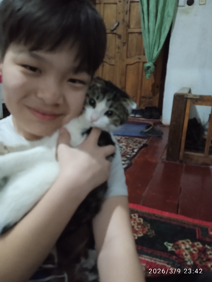 young male subject, presumed to be a juvenile, with dark hair, smiling and looking towards the camera. He is wearing a light-colored t-shirt and holding a domestic cat against his chest. The cat has white fur on its face and chest, with dark tabby markings on its head and back. Its eyes are light-colored. The scene is indoors in Khujayli, Uzbekistan. The background features reddish-brown wooden floorboards partially covered by a dark rug with red and orange patterns. A plain dark blue mat and a pair of dark sandals are visible on the floor further back. A wooden door with vertical panels and a dark handle is discernible behind the subjects, along with a crumpled light green fabric curtain hanging to the door's right. A wooden furniture frame is present on the right edge of the frame. The timestamp 2026/3/9 23:42 is visible in the bottom right corner.