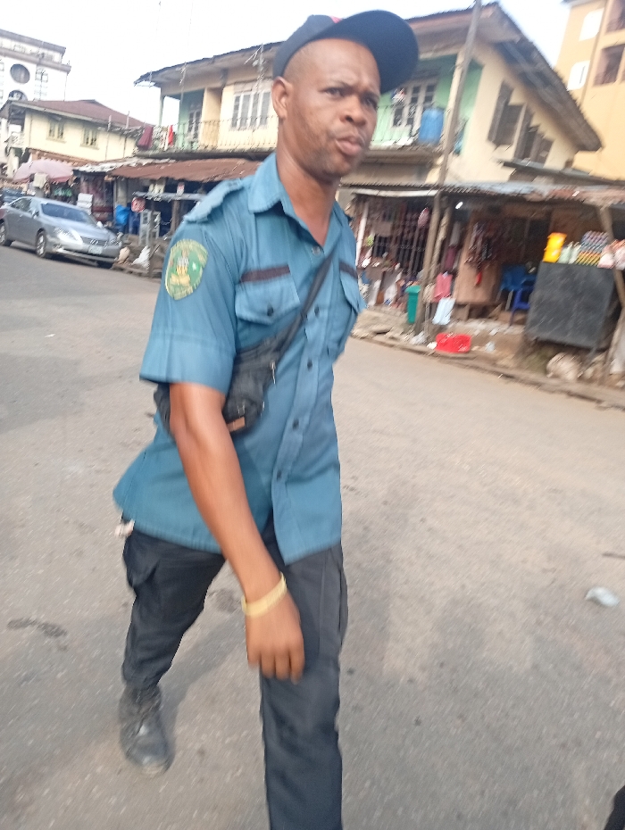 A man wearing a blue button-down shirt, dark pants, and a black baseball cap walks on a street. The shirt has a patch on the sleeve. A black bag is slung across his torso. The background shows buildings, some with tin roofs, and a silver car. The street appears to be in a market or commercial area.