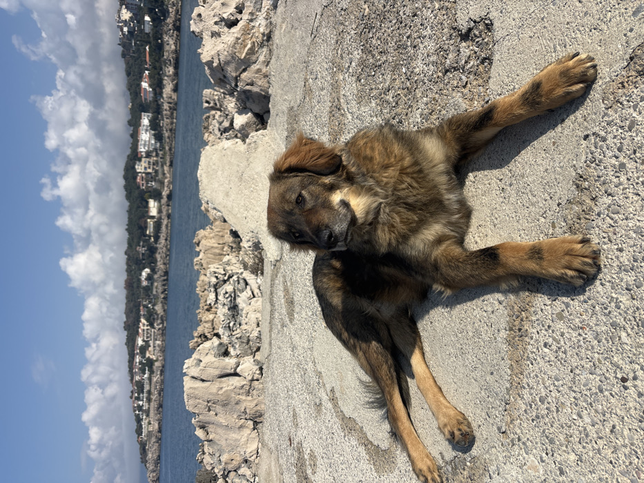 - "The image displays a medium-sized dog with a shaggy brown and tan coat lying on a grey concrete surface in a coastal area of Kunje, Montenegro" by FM-CAOHw1, licensed under CC BY 4.0